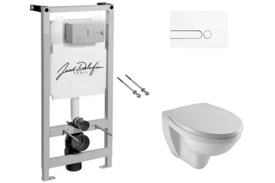 Комплектация: Инсталляция Jacob Delafon E5504-NF + Унитаз подвесной Jacob Delafon Patio E4187-00 + Крышка-сиденье Soft Close E70021-00 + Кнопка смыва, белая E4326-00 + Комплект креплений. Звукоизоляционная прокладка приобретается отдельно.