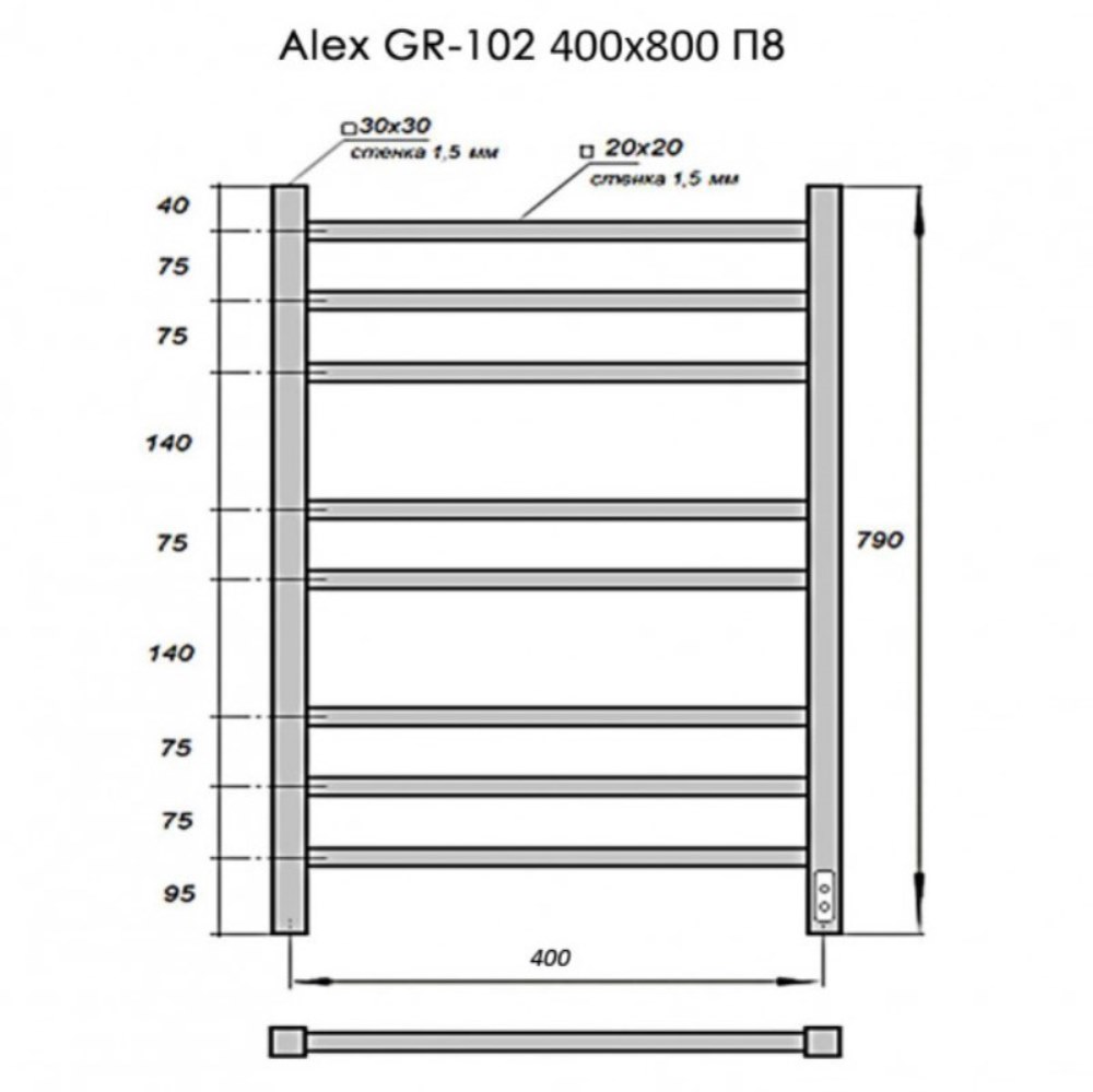 Полотенцесушитель электрический Grois Alex с высотой 79 см., используется для обогрева и сушки помещения. Нижнее подключение. Изготовлен Изготовлен из нержавеющей стали.