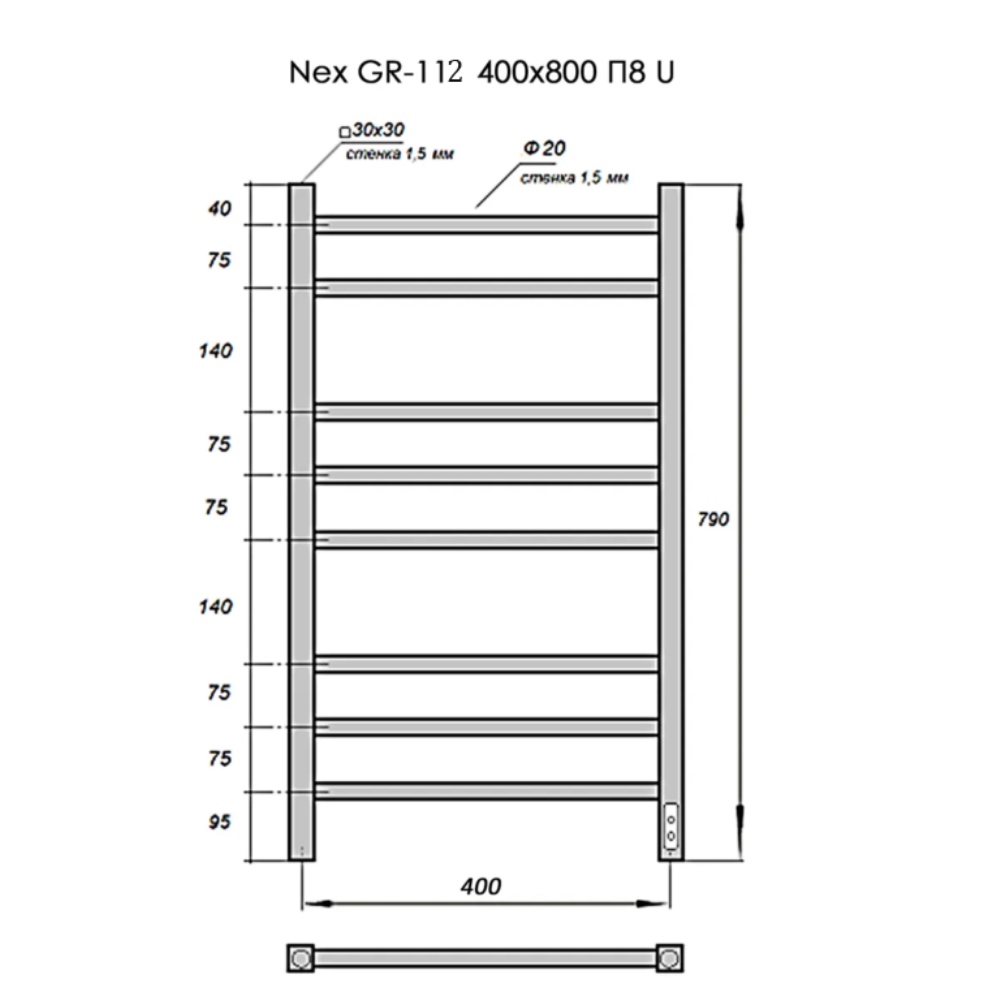 Полотенцесушитель электрический Grois Nex с высотой 79 см., используется для обогрева и сушки помещения. Нижнее подключение. Изготовлен Изготовлен из нержавеющей стали.