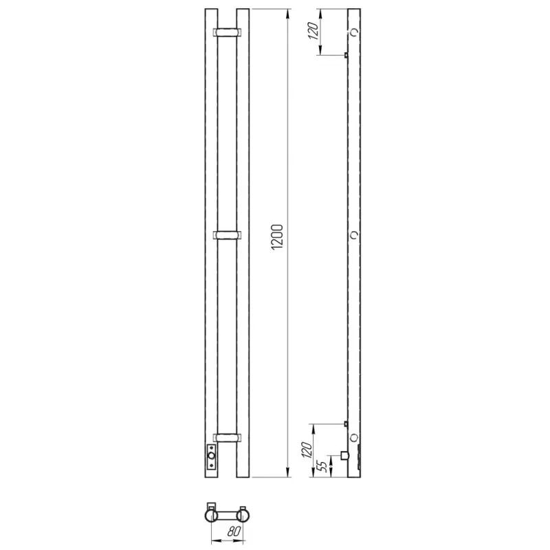 Полотенцесушитель электрический Laris Прайм Дуэт с высотой 120 см., используется для обогрева и сушки помещения. Нижнее подключение. Изготовлен из черной стали.