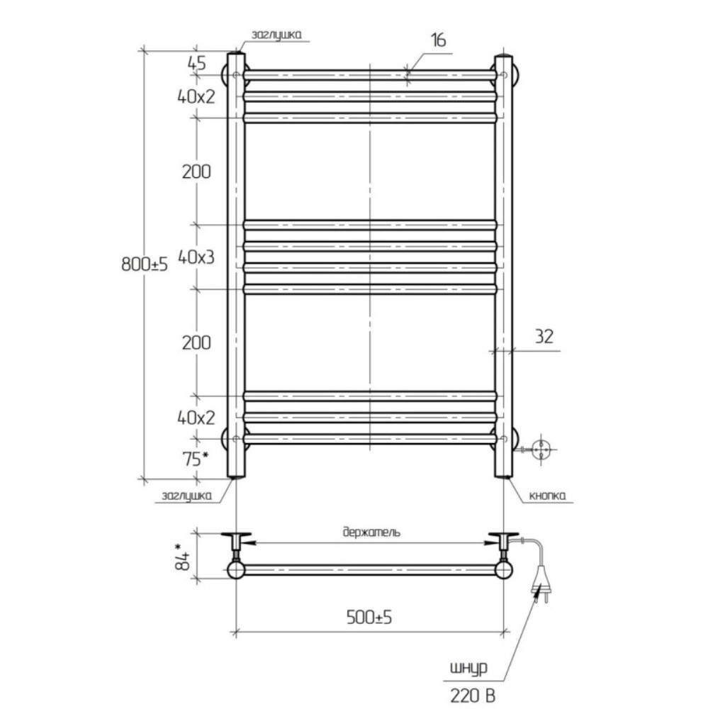 Полотенцесушитель электрический Тера Богема 50х80 кнопка включения, телескоп.держатели Белый ПСК-15-03б