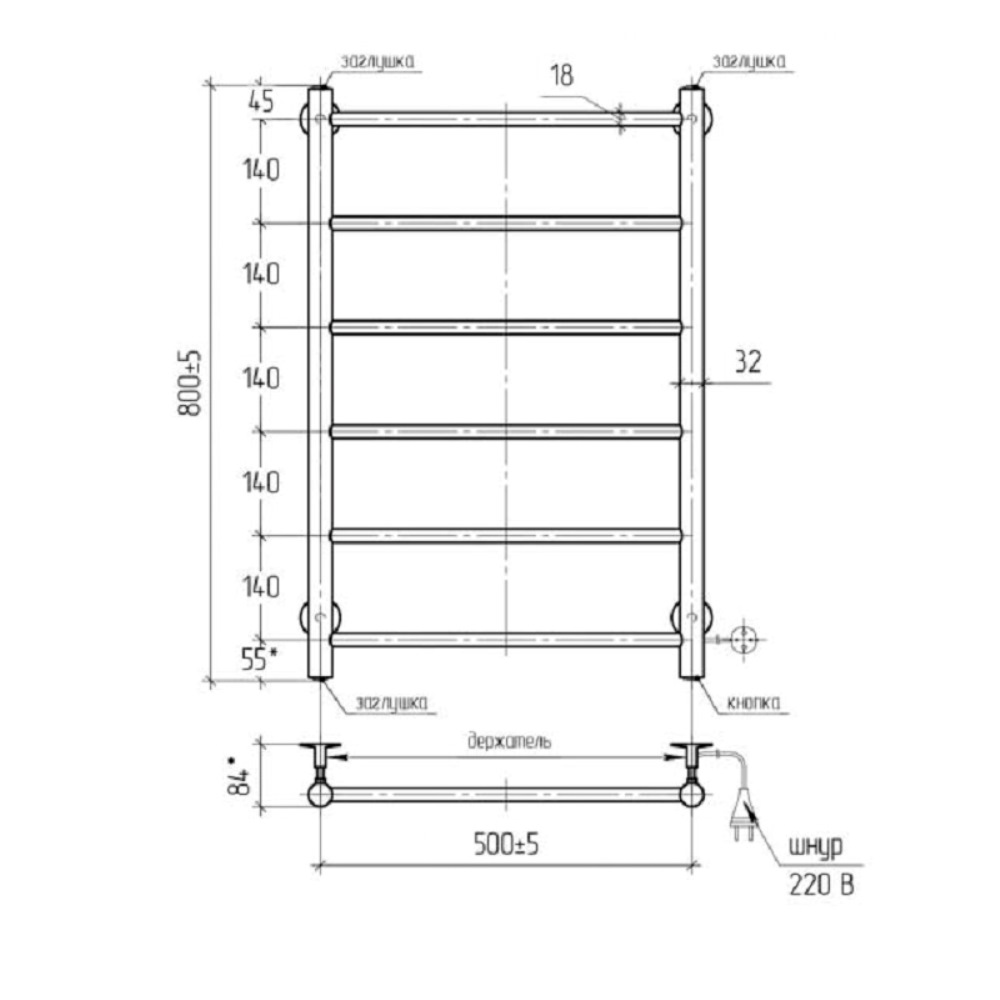 Полотенцесушитель электрический Тера Классика 50х80 кнопка включения, телескоп.держатели Хром глянцевый ПСК-09-05
