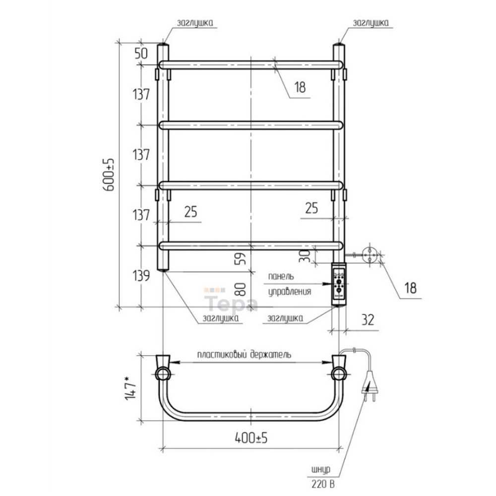 Полотенцесушитель электрический Тера Мост с высотой 60 см., используется для обогрева и сушки помещения. Нижнее подключение. Изготовлен из нержавеющей стали.