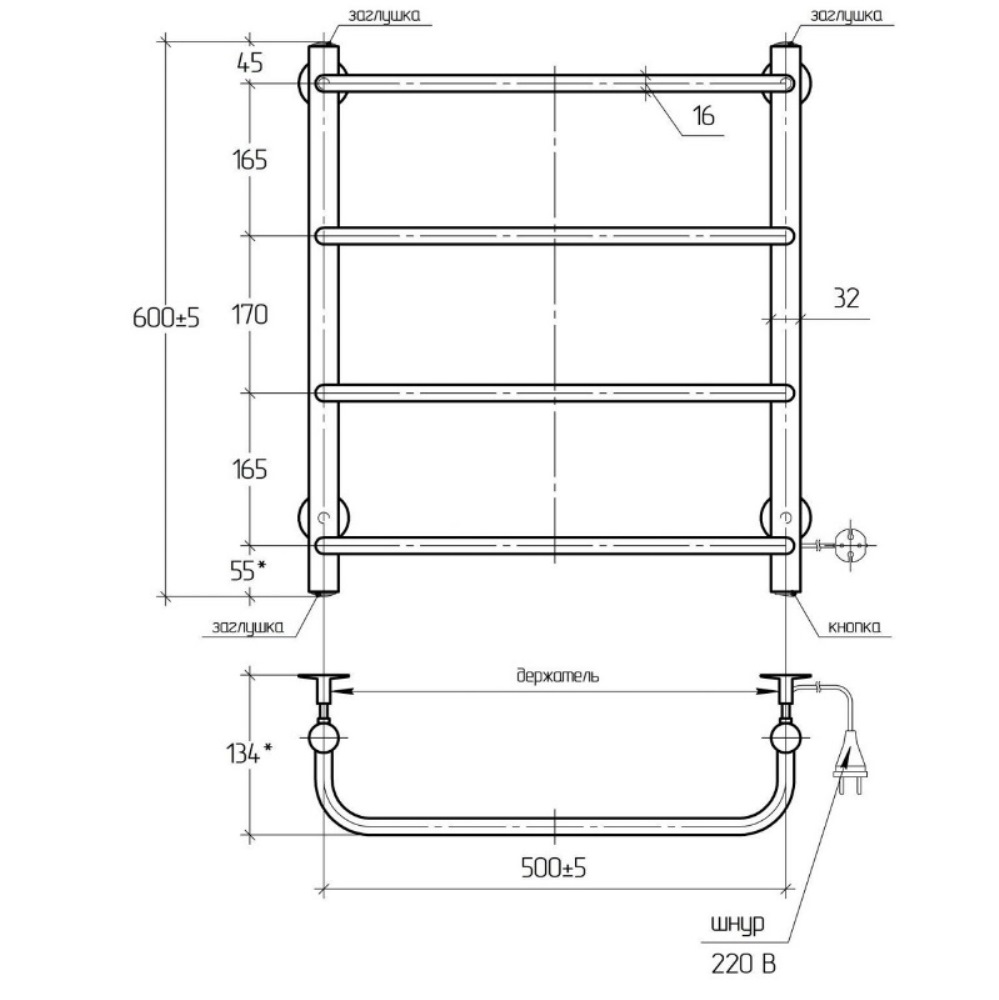 Полотенцесушитель электрический Тера Мост 50х60 кнопка включения, телескоп.держатели Хром глянцевый ПСК-12-02