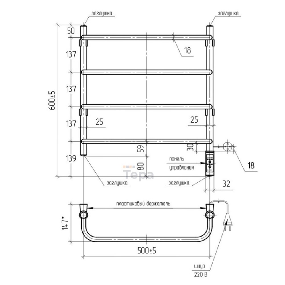 Полотенцесушитель электрический Тера Мост с высотой 60 см., используется для обогрева и сушки помещения. Нижнее подключение. Изготовлен из нержавеющей стали.