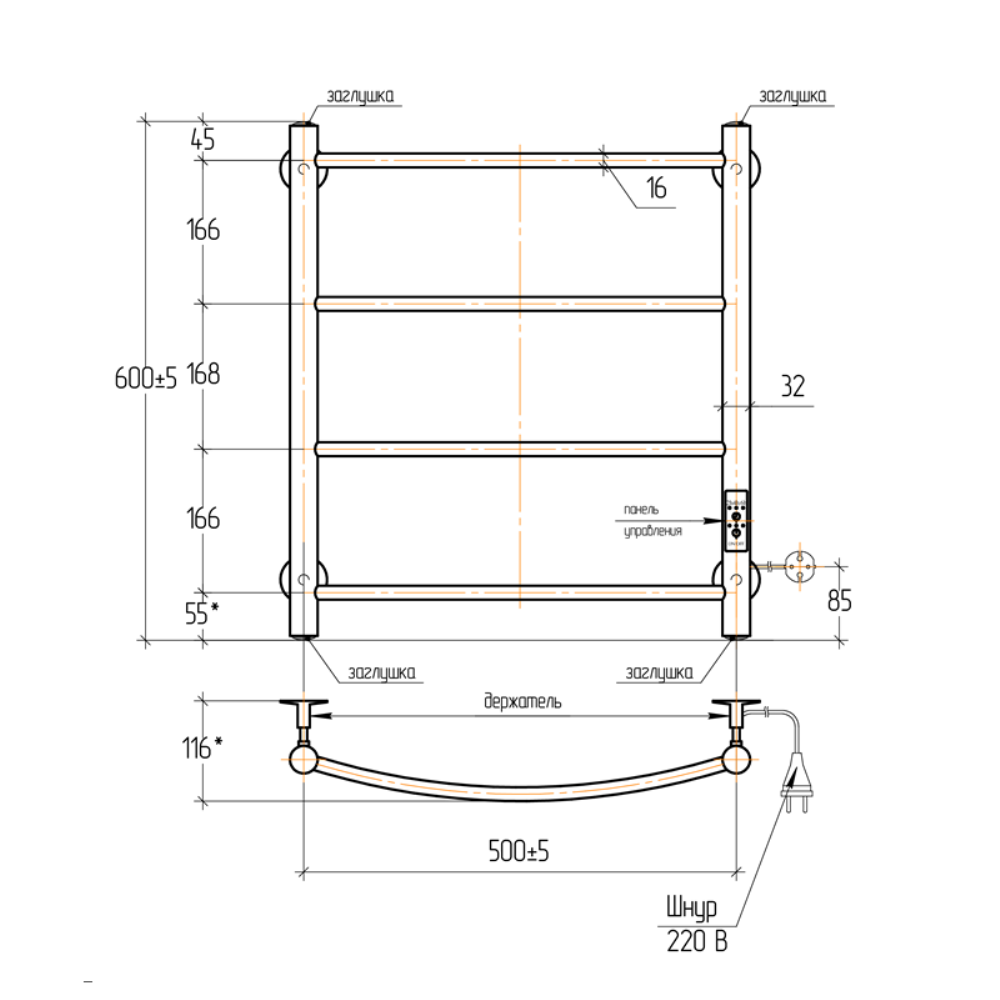 Полотенцесушитель электрический Тера Ребро с высотой 60 см., используется для обогрева и сушки помещения. Нижнее подключение. Изготовлен из нержавеющей стали.