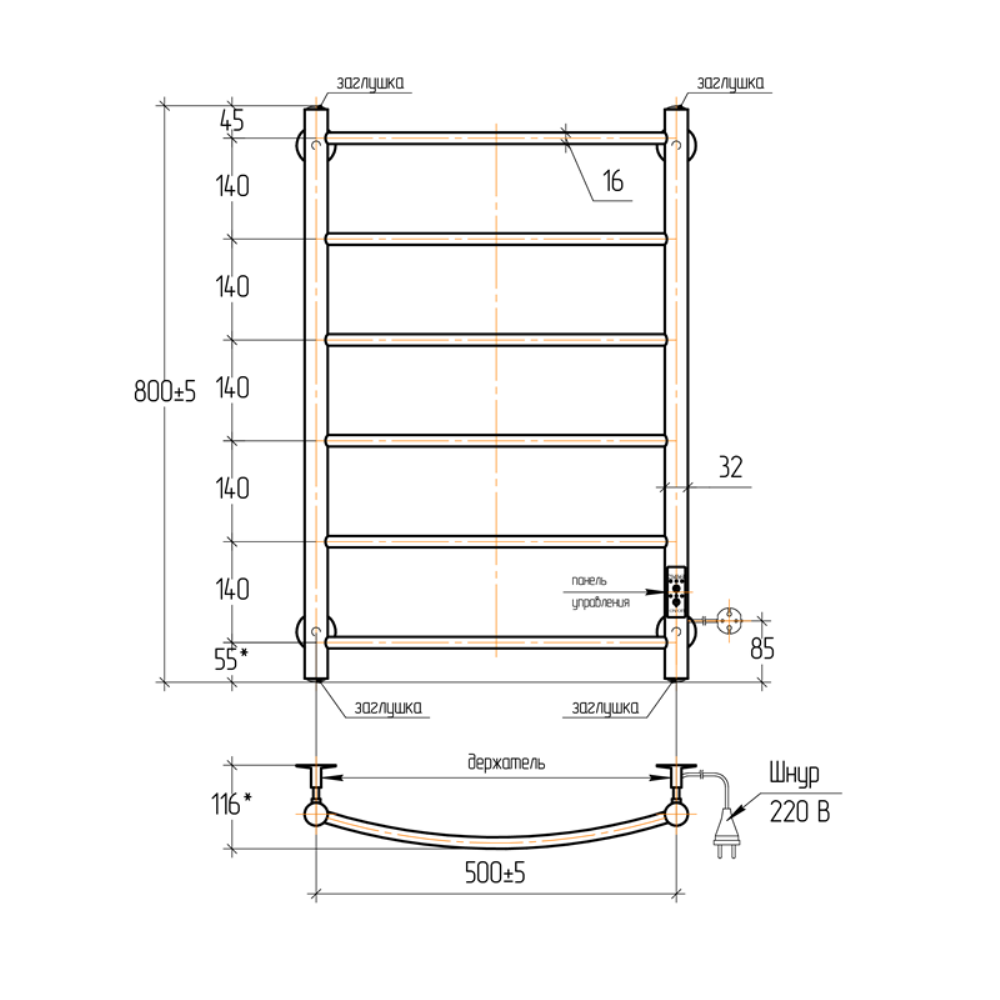 Полотенцесушитель электрический Тера Ребро с высотой 80 см., используется для обогрева и сушки помещения. Нижнее подключение. Изготовлен из нержавеющей стали.