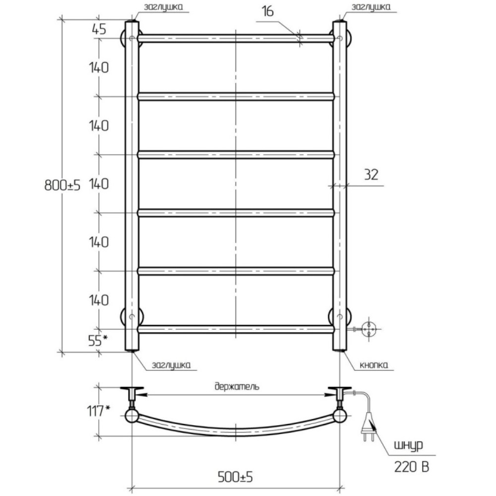 Полотенцесушитель электрический Тера Ребро 50х80 кнопка включения, телескоп.держатели Белый ПСК-10-03б