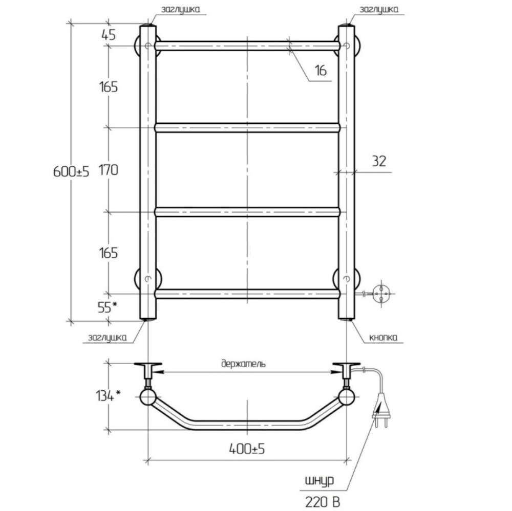 Полотенцесушитель электрический Тера Виктория 40х60 кнопка включения, телескоп.держатели Хром глянцевый ПСК-11-01