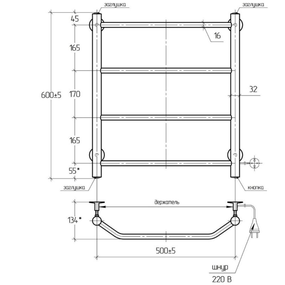 Полотенцесушитель электрический Тера Виктория 50х60 кнопка включения, телескоп.держатели Белый ПСК-11-02б