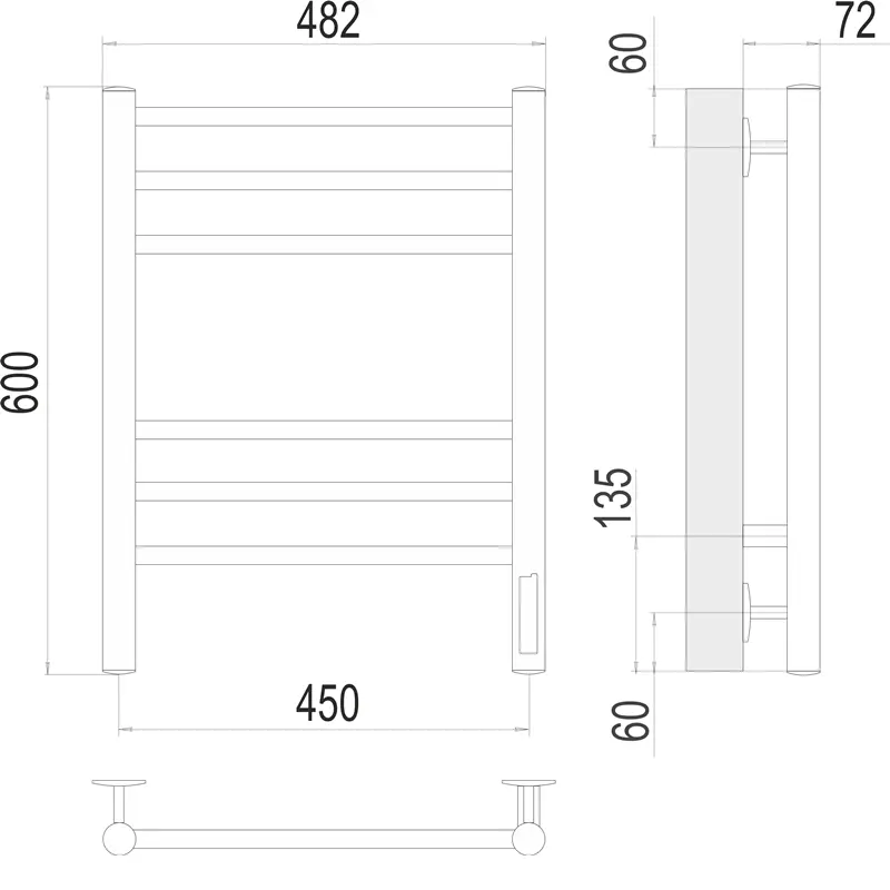 Полотенцесушитель электрический Terminus Аврора П6 с высотой 60 см, используется для обогрева и сушки помещения площадью 1,5 кв.м. Подключение нижнее. Изготовлен из нержавеющей стали.