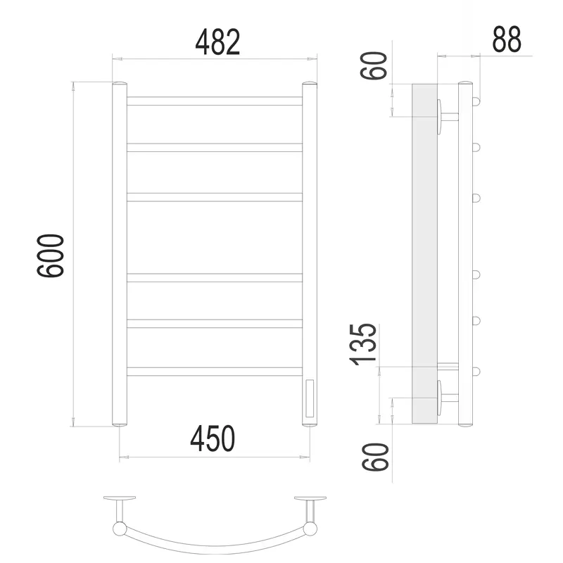 Полотенцесушитель электрический Terminus Классик П6 с высотой 60 см, используется для обогрева и сушки помещения площадью 1,5 кв.м. Подключение нижнее. Изготовлен из нержавеющей стали.