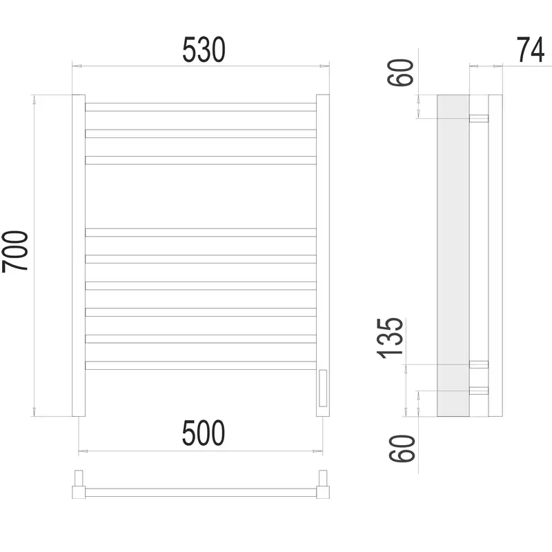 Полотенцесушитель электрический Terminus Сицилия П9 с высотой 70 см, используется для обогрева и сушки помещения площадью 2 кв.м. Подключение нижнее. Изготовлен из нержавеющей стали.