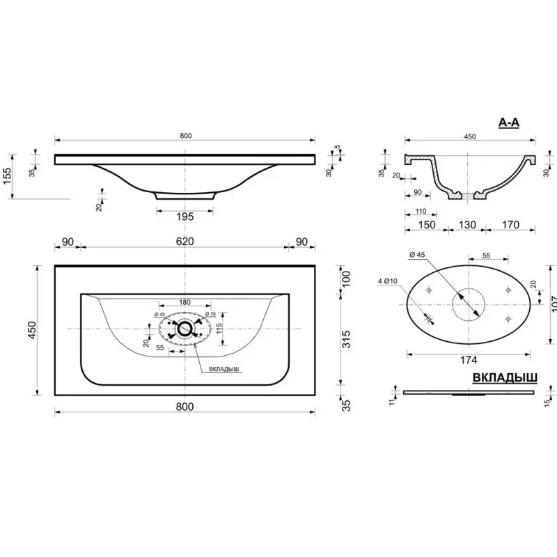 | Отверстия под смеситель | На 1 отверстие |