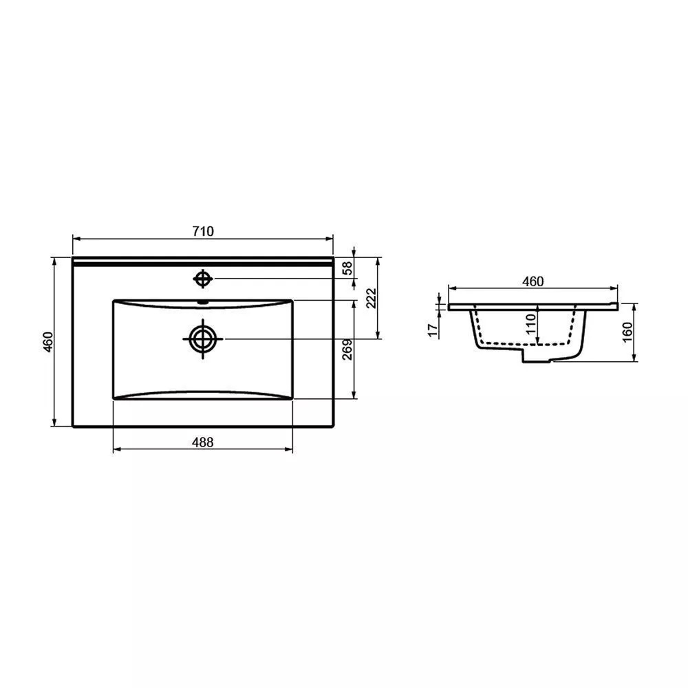 Раковина на мебель Comforty имеет размер 71х46 см, обладает прямоугольной формой. На 1 отверстие для смесителя. Модель гармонично впишется в интерьер любой ванной комнаты.
