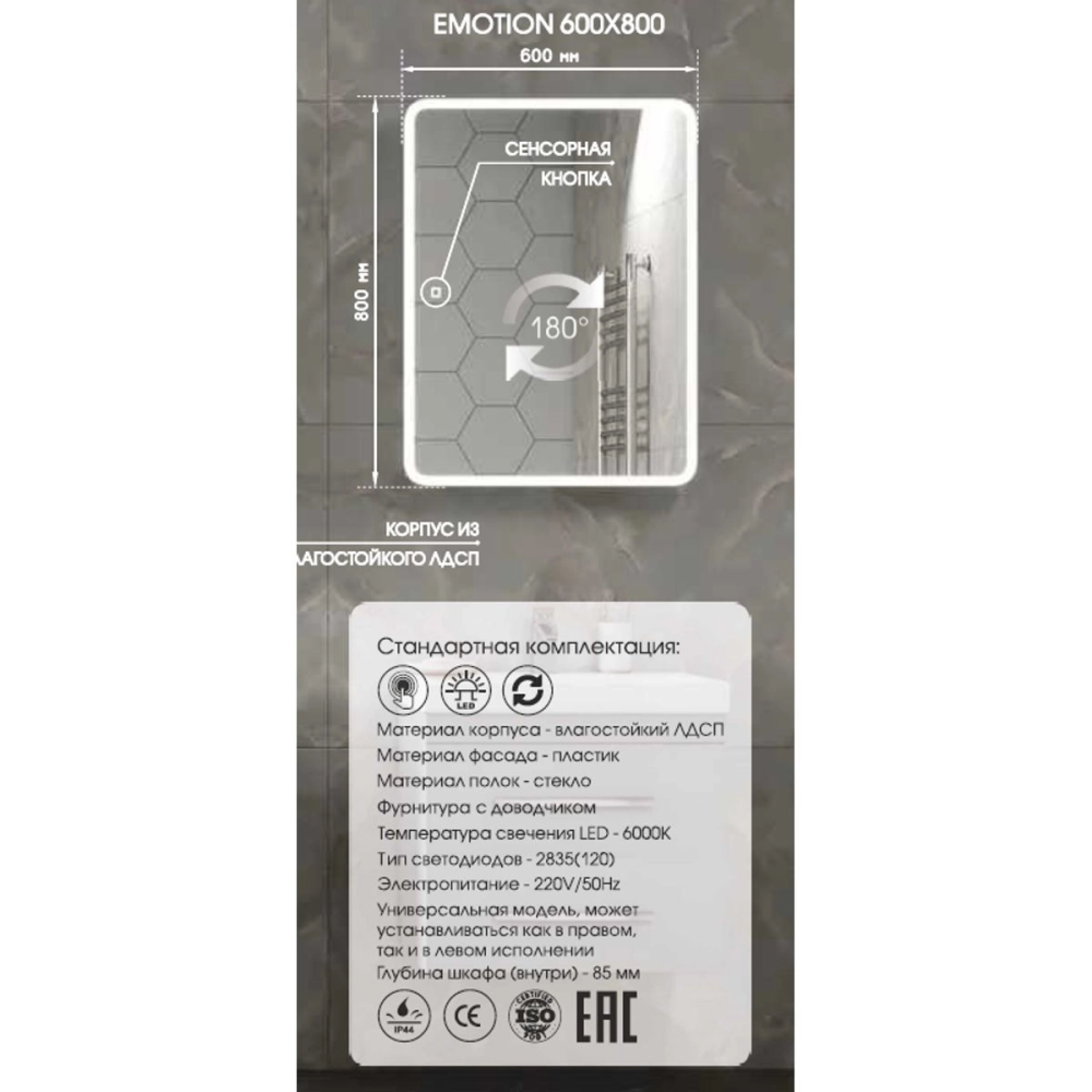 Шкаф зеркальный Агата из коллекции Emotion с сенсором и розеткой Race с механическим выключателем, универсальное — идеальное дополнение ванной комнаты в современном стиле. Модель изготовлена из качественных материалов, имеет прямоугольную форму и размер 60х80 см. В коллекции представлены — тумбы, раковины, шкафчики и пеналы.
