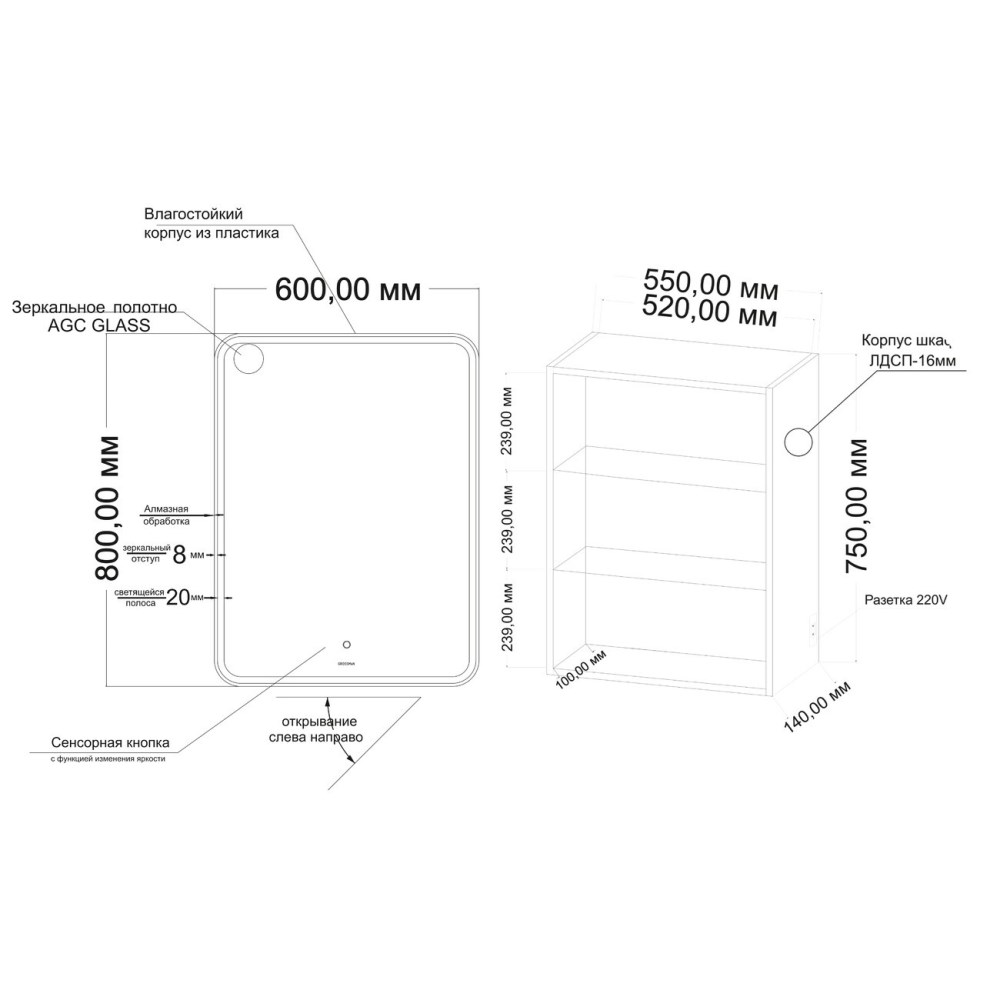 Шкаф зеркальный Grossman Адель 60 правый с LED подсветкой Белый 206004