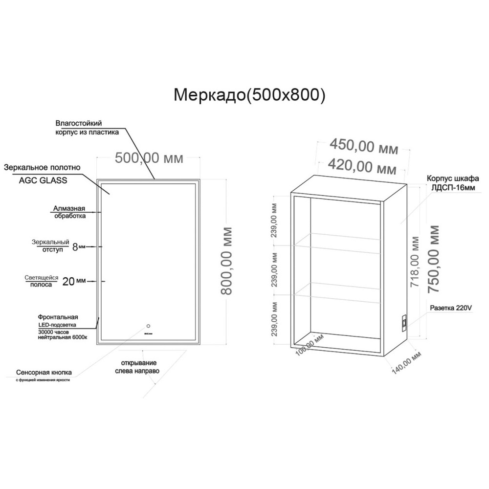 Шкаф зеркальный Grossman Меркадо 50 правый с LED подсветкой Белый 205005