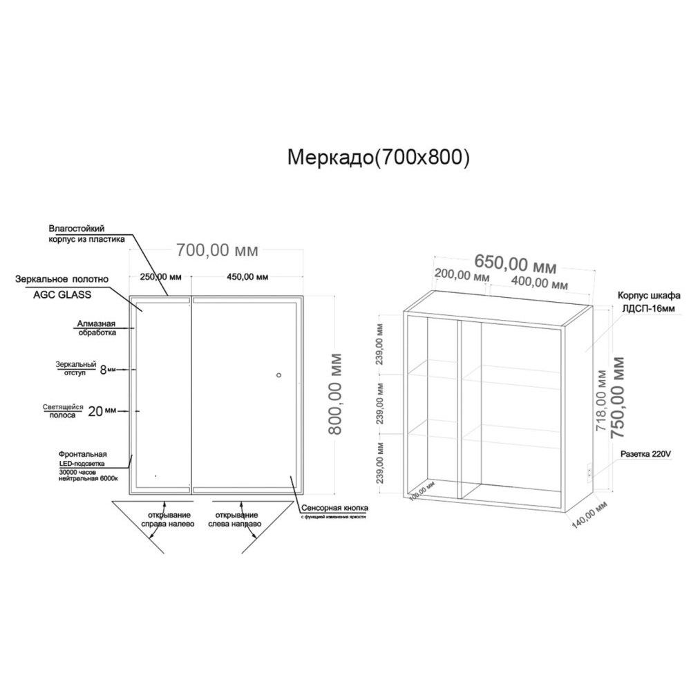 Шкаф зеркальный Grossman Меркадо 70 правый с LED подсветкой Белый 207008