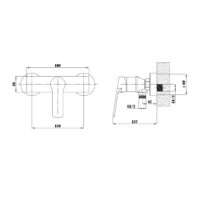 Смеситель для душа Esko Singapore SB 80 без излива. Изготовлен из качественных материалов и имеет защитное покрытие, что способствует устойчивости к коррозии и резким перепадам температуры. Управление рычажное, настенный монтаж на два отверстия.
