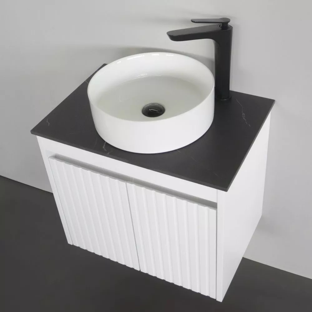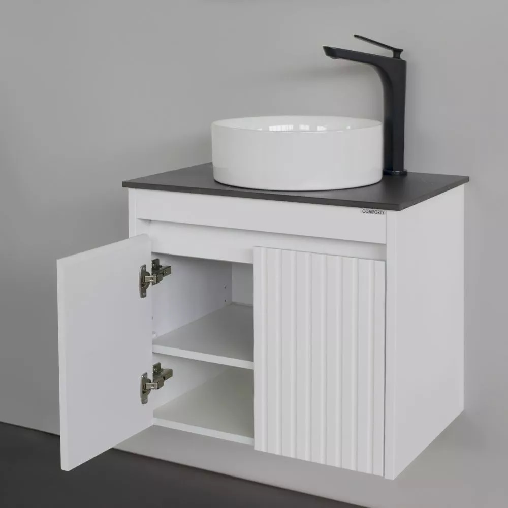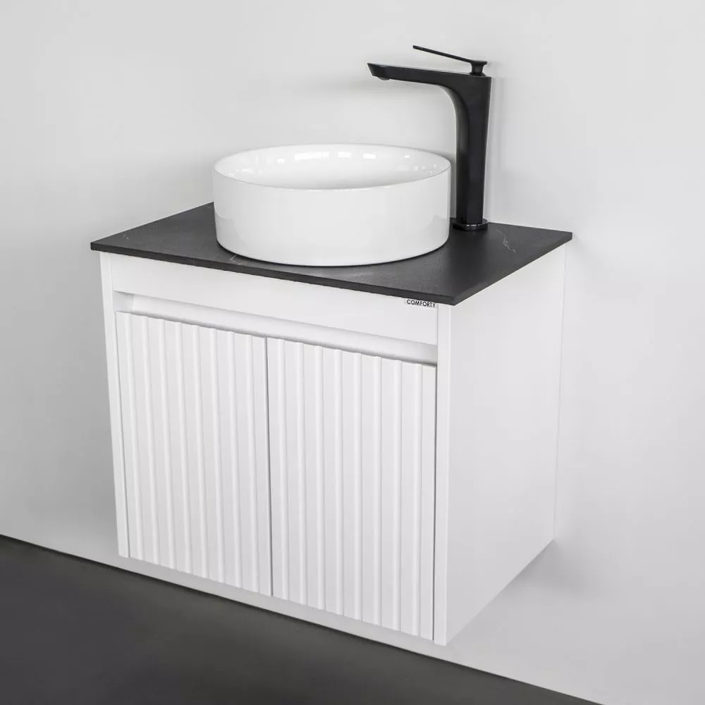 Тумба подвесная Comforty Двина 60 со столешницей мрамор Калакатта Блэк с раковиной 9111 Белый матовый 00-00019069CF