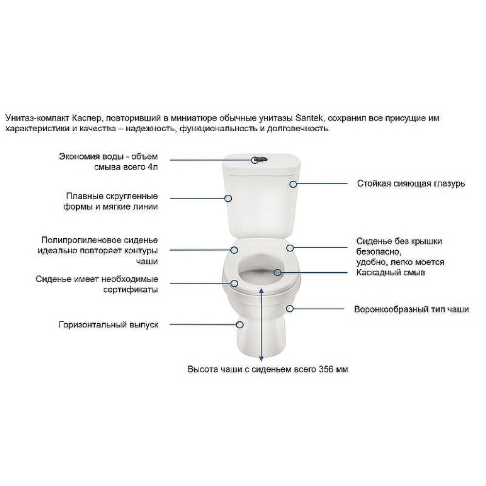Унитаз-компакт Santek Каспер предназначен для стандартного напольного монтажа, направление выпуска – горизонтальное. Чаша и бачок унитаза изготовлены из санфарфора. Крышка-сиденье в комплекте.
