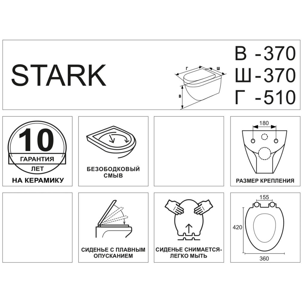 Унитаз подвесной Kirovit Stark предназначен для установки с системой инсталляции скрытого монтажа. Крышка-сиденье в комплекте.