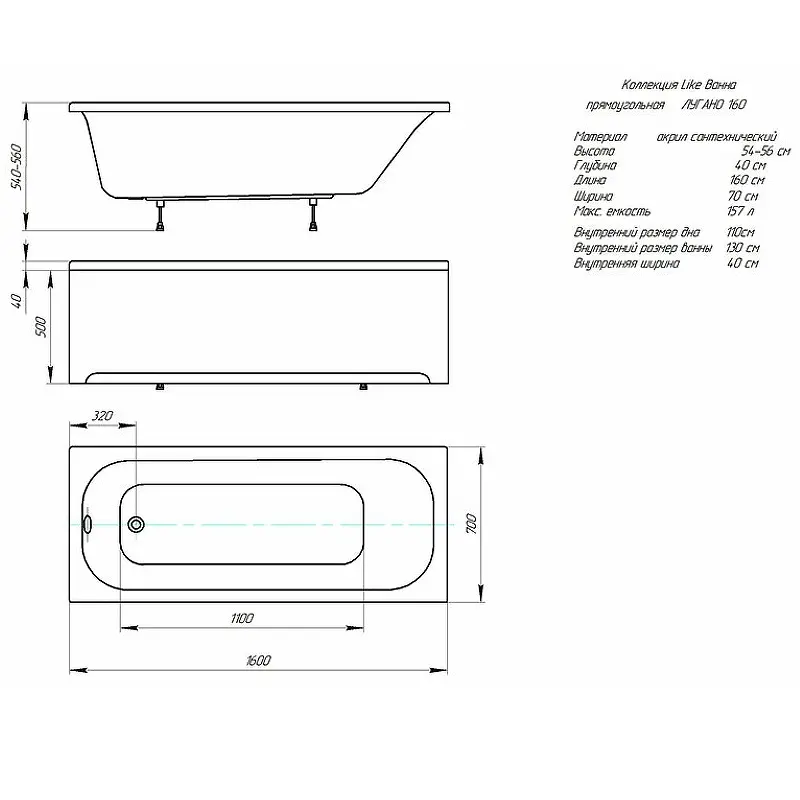 Ванна акриловая Aquatek Лугано 160х70 Белый LUG160-0000001