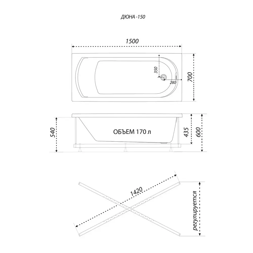 Акриловая ванна Triton из коллекции Дюна имеет размер 150х70 см. Форма прямоугольная. Страна изготовитель — Россия. Каркас и установочный комплект, слив-перелив не входит в базовую комплектацию и приобретается отдельно. Дополнительно комплектуется смесителем, передней и(или) боковой панелью.