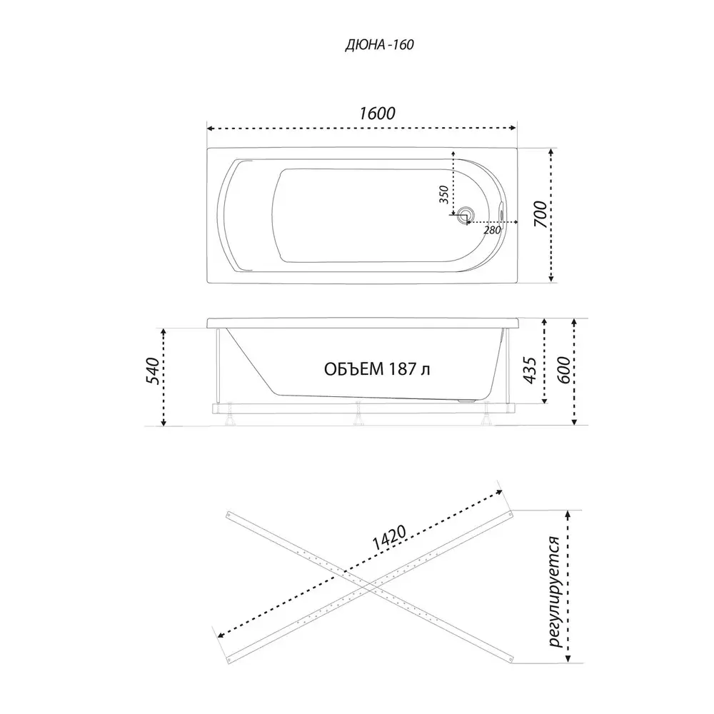 Акриловая ванна Triton из коллекции Дюна имеет размер 160х70 см. Форма прямоугольная. Страна изготовитель — Россия. Каркас и установочный комплект, слив-перелив не входит в базовую комплектацию и приобретается отдельно. Дополнительно комплектуется смесителем, передней и(или) боковой панелью.