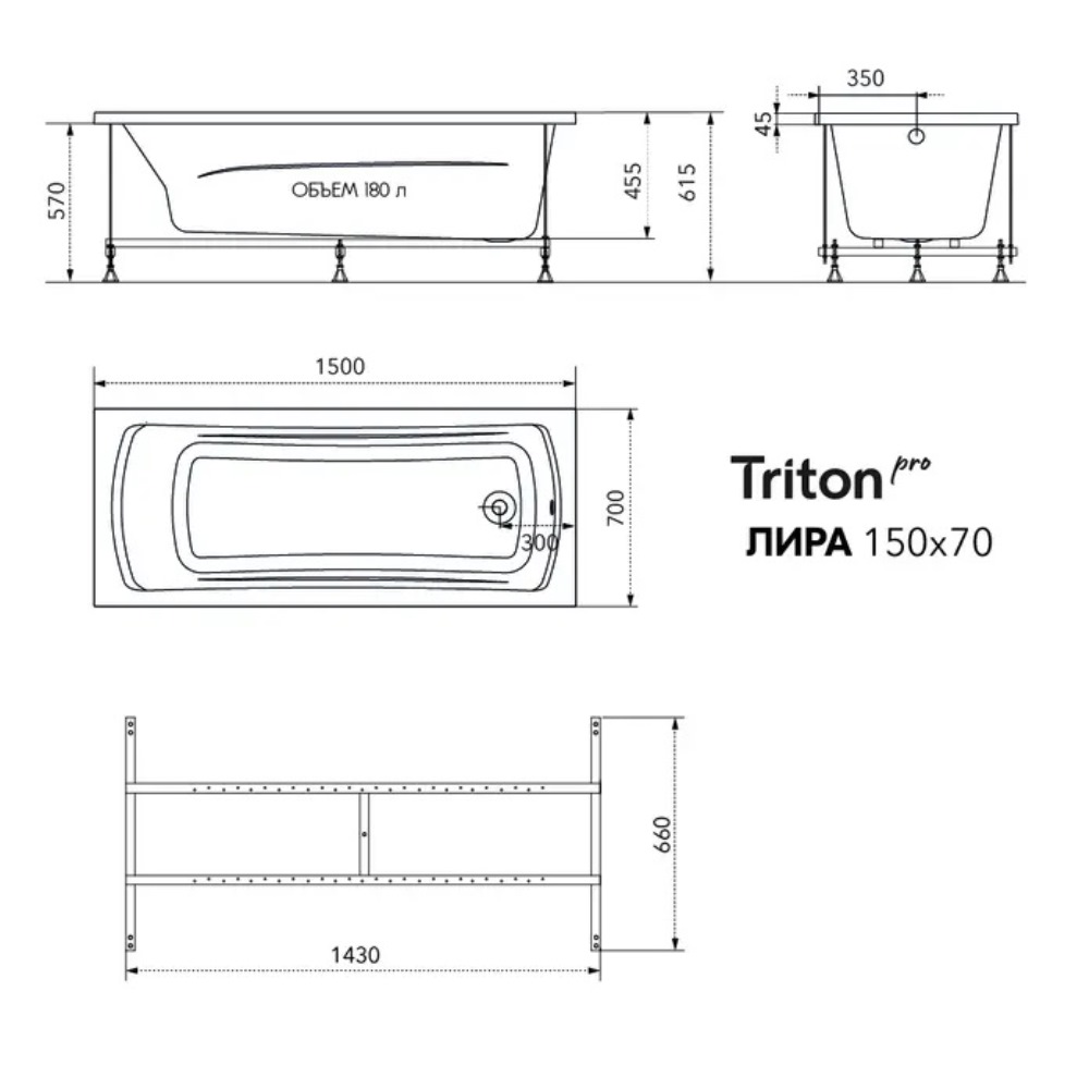 Ванна акриловая Triton Лира имеет размер 150х70 мм. Прямоугольная форма. Цена указана отдельно за ванну. В комплекте необходимо иметь опорную конструкцию или каркас, сточный комплект.