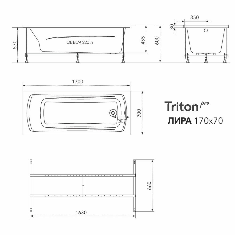 Ванна акриловая Triton Лира имеет размер 170х70 мм. Прямоугольная форма. Цена указана отдельно за ванну. В комплекте необходимо иметь опорную конструкцию или каркас, сточный комплект.