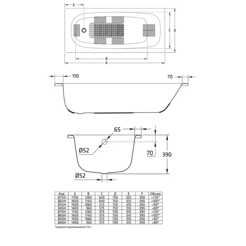 Ванна стальная BLB Universal 170х70 с отверстиями для ручек Белый B70HO