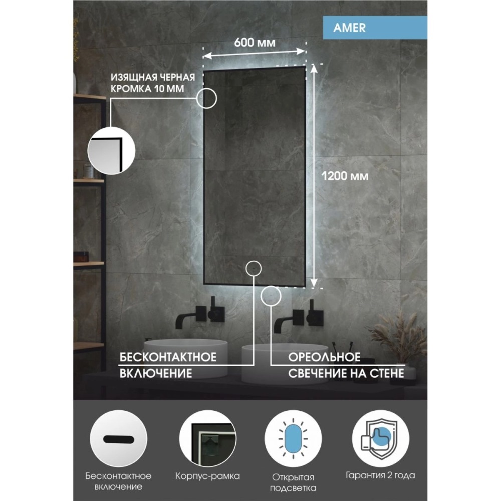 Зеркало Агата Amer 60 с бесконтактным сенсором с фоновой подсветкой Черный ЗЛП1527