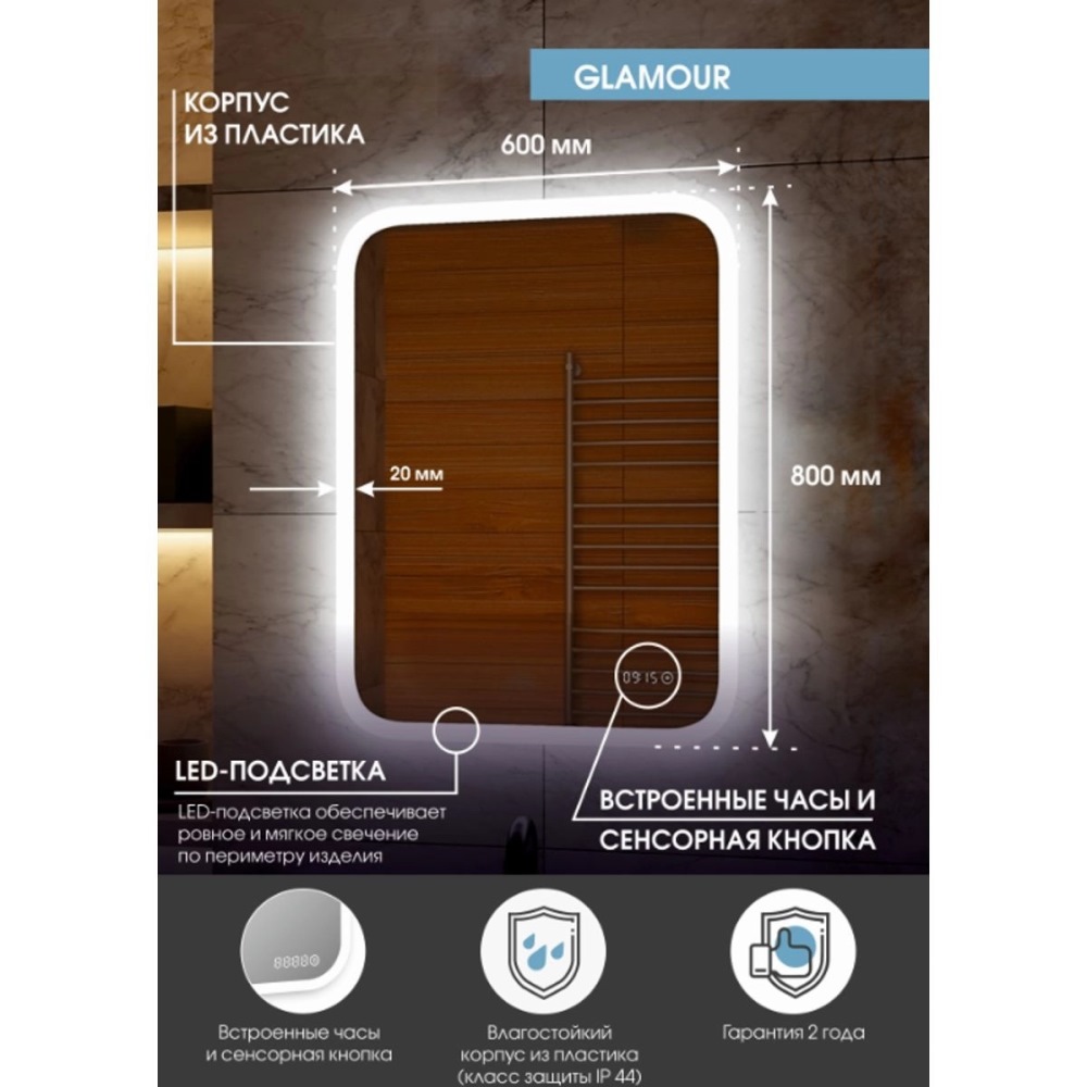 Зеркало Агата Glamour с сенсором и часами – идеальное дополнение ванной комнаты в современном стиле. Модель изготовлена из качественных материалов, имеет прямоугольную форму и размер 60х80 см. В коллекции представлены: тумбы, раковины, шкафчики и пеналы.