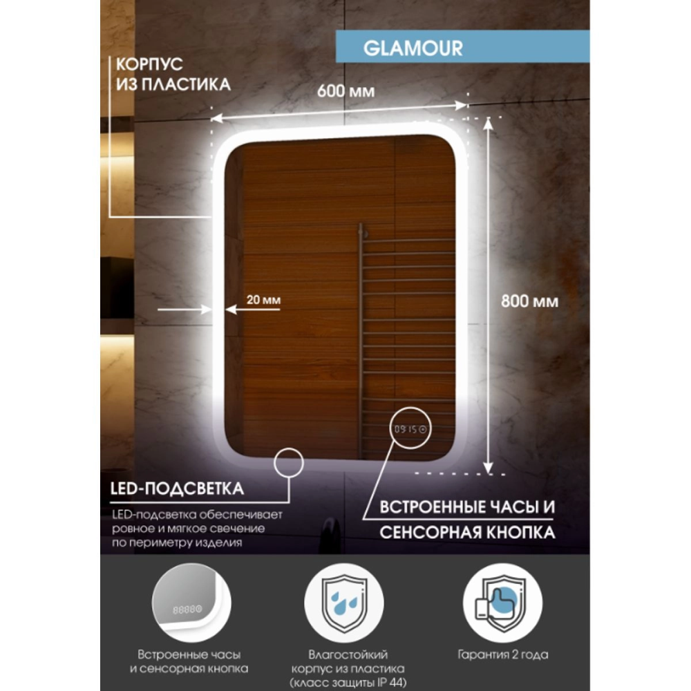 Зеркало Агата Glamour 60 с сенсором, подогревом и часами ЗЛП264
