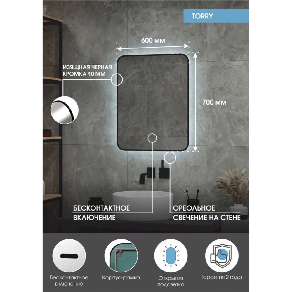 Зеркало Агата Torry 60 с бесконтактным сенсором, с фоновой подсветкой, подогрев Черный ЗЛП2026
