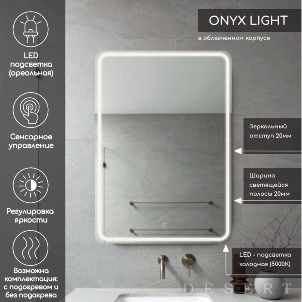 Зеркало Desert Onyx Light с сенсором и подогревом – идеальное дополнение ванной комнаты в современном стиле. Модель изготовлена из качественных материалов, имеет прямоугольную форму и размер 100х80 см. В коллекции представлены: тумбы, раковины, шкафчики и пеналы.